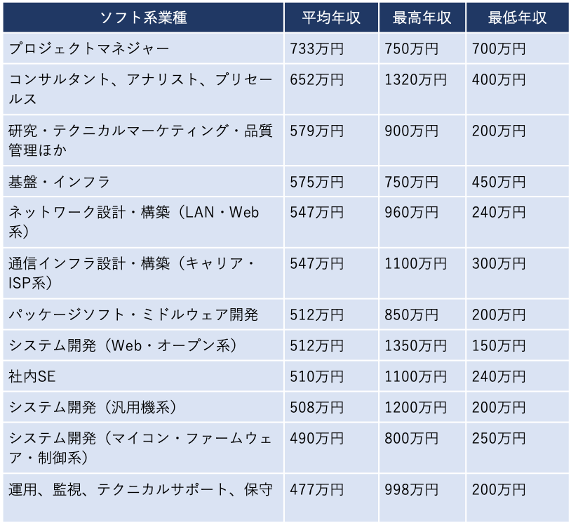 ソフト系職種の給料の相場(平均年収)は、550万前後。ハード系職種では500万前後のため、ソフト系職種の方が平均年収相場は高いということになります。