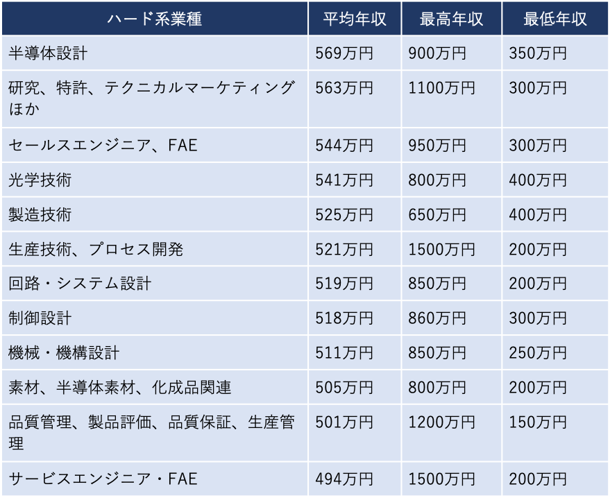 ソフト系職種では、コンサルタント業・システム開発職の最高年収は1千万円を上回りますが、一方で最低年収がそれほど高くないため、個人によって差が生じることが伺えます。ハード系職種でも、サービスエンジニア・生産技術職において、最高年収が高いのに最低年収は低いという現象が起こっています。