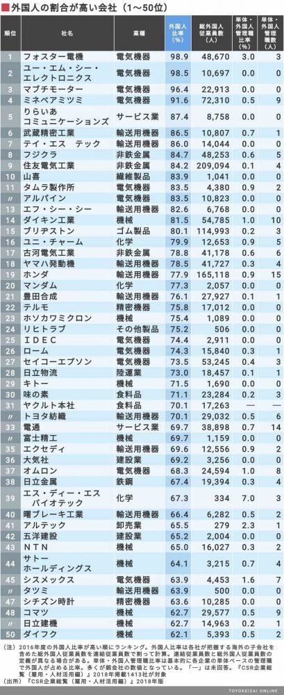外国人採用が多い国内企業ランキングの11位から50位までに入っている企業には、どのような特徴があるのでしょうか。引き続き2016年の東洋経済オンラインの記事を元にご紹介いたします。